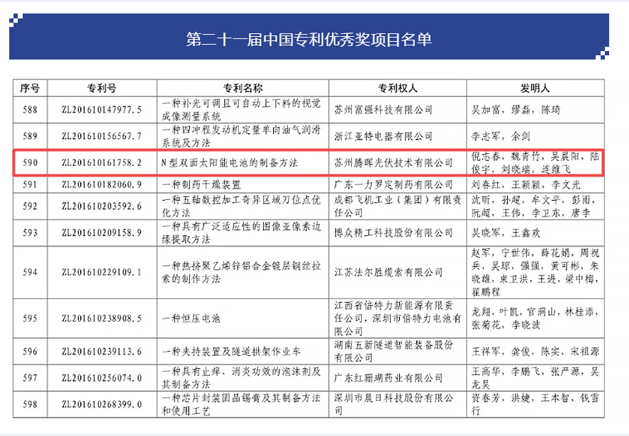 近日,國(guó)家知識(shí)產(chǎn)權(quán)局發(fā)布了第二十一屆中國(guó)專利獎(jiǎng)?lì)A(yù)獲獎(jiǎng)項(xiàng)名單,蘇州騰暉光伏技術(shù)有限公司的“N型雙面太陽(yáng)能電池的制備方法”(ZL201610161758.2)專利榮獲中國(guó)專利獎(jiǎng)優(yōu)秀獎(jiǎng)。